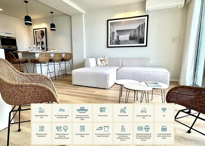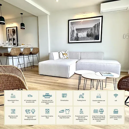 تتميّز شقة Appart Matisse Face Mer Parking بإطلالات على البحر، وتشتمل على الشرفة والتراس ومنطقة الجلوس المجهزة بمكيف الهواء. تمّ تجهيز الشقة بحمام يحتوي على مجفف الشعر وبرانص الحمام والمناشف. علاوة على ذلك، هناك المرحاض المنفصل والدوش.